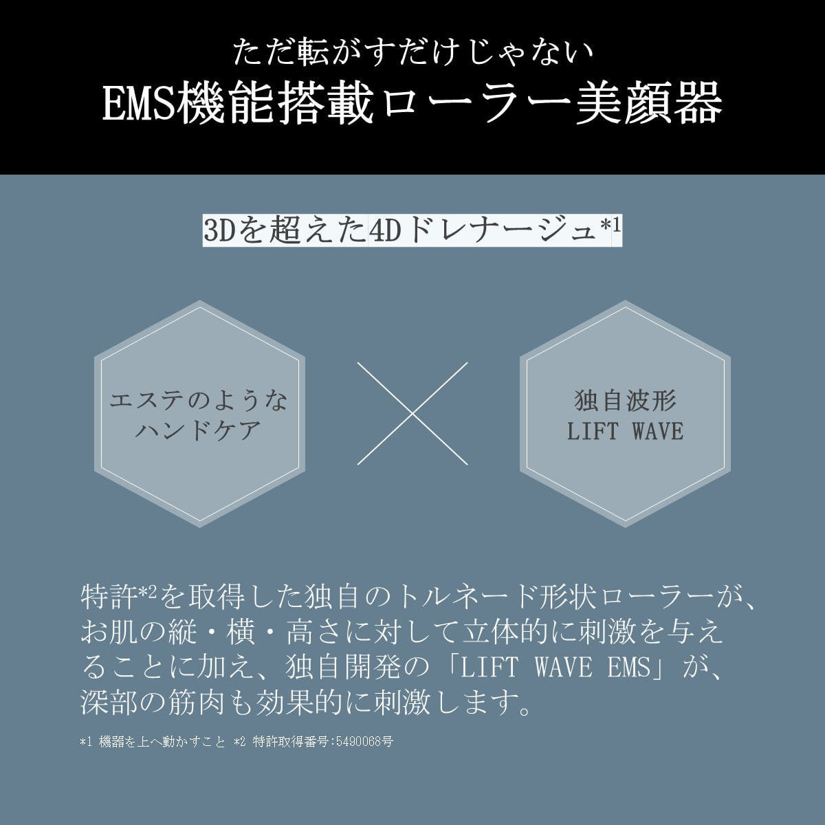特許*2を取得した独自のトルネード形状ローラーが、お肌の縦・横・高さに対して立体的に刺激を与えることに加え、独自開発の「LIFT WAVE EMS」が、深部の筋肉も効果的に刺激します。